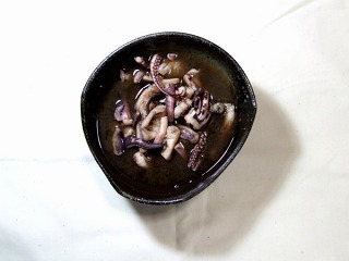 新鮮なイカの墨をかつおだしベースのスープに入れ、塩または味噌で味を調える。