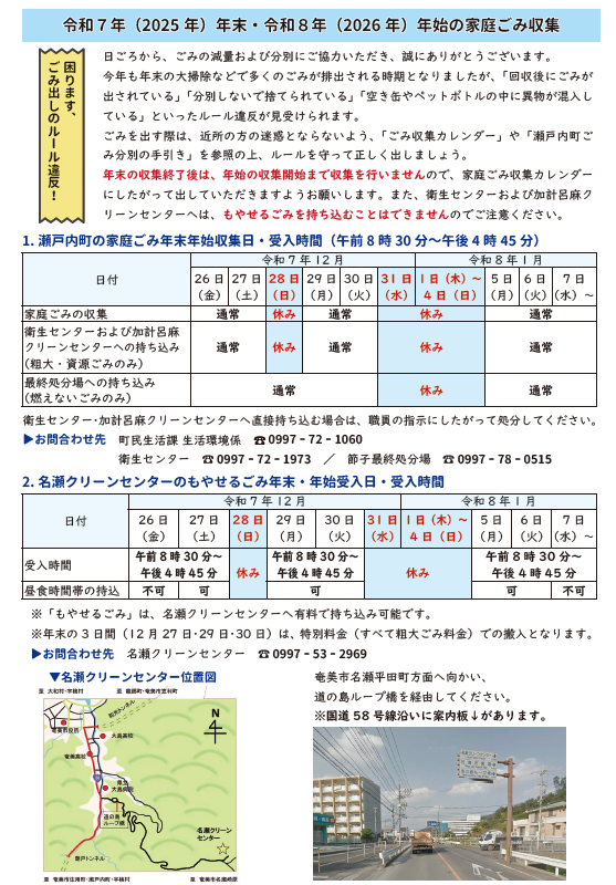 ホーム > 暮らし・コミュニティ > ごみ・リサイクル > 瀬戸内町衛生センター・名瀬クリーンセンター年末年始のお知らせ