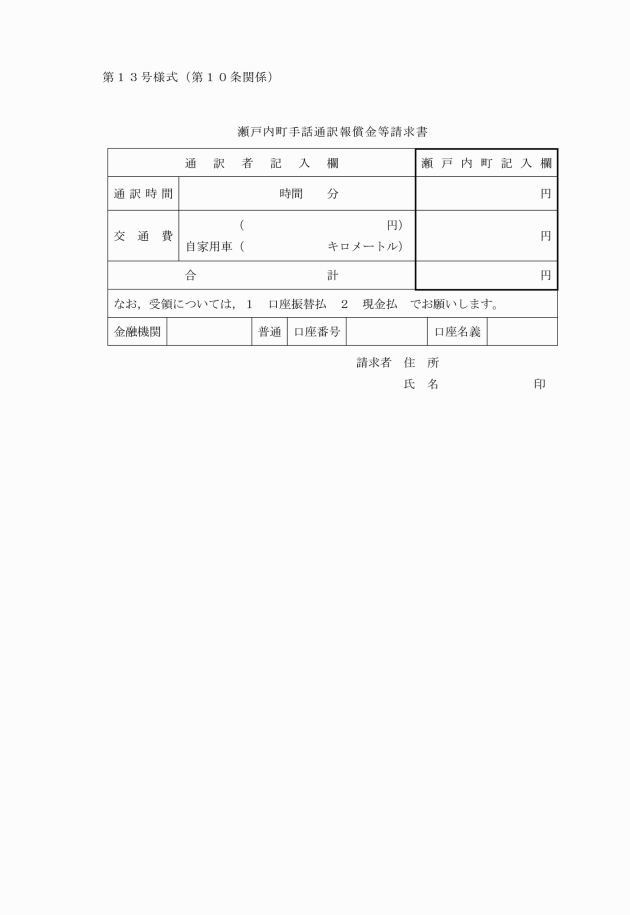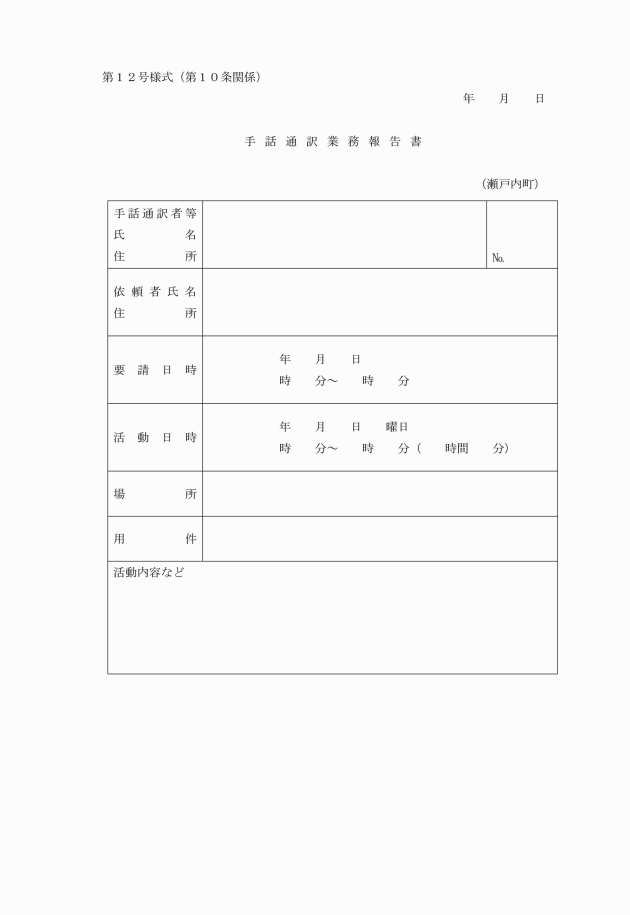 第7条 手話通訳者等の派遣の申込みをしようとする者(以下「申込者」という。)は,事前に手話通訳者等派遣申込書(別記第6号様式)を町長に提出しなければならない。ただし,閉庁時における病気,事故等の緊急の場合に限り,事後において提出することができる。