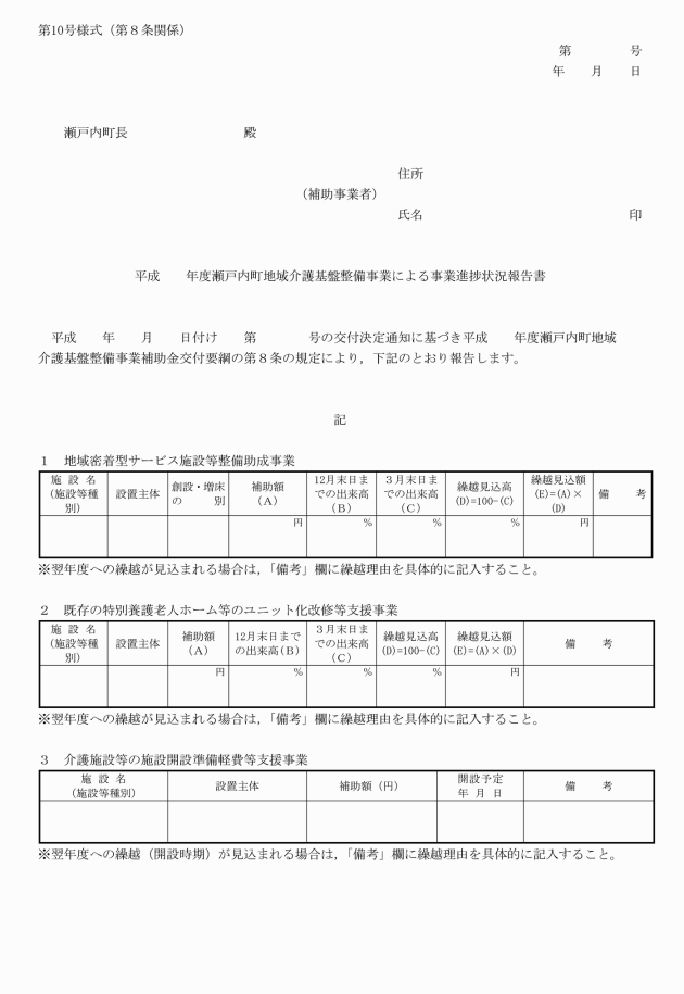 第8条 状況報告は,事業の進捗状況について別記第10号様式により毎年度12月末日現在の状況を翌月10日までに町長に報告するものとする。
