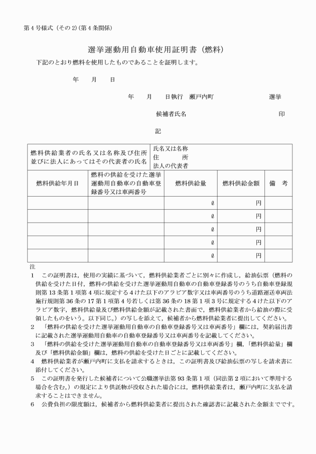 第4条 候補者は,選挙運動用自動車使用証明書,ビラ作成証明書又はポスター作成証明書を,使用,作成の実績に基づき作成し,条例第3条に規定する有償契約を締結した一般乗用旅客自動車運送事業を経営する者その他の者,ビラ作成業者又はポスター作成業者(以下「契約業者等」という。)に提出しなければならない。